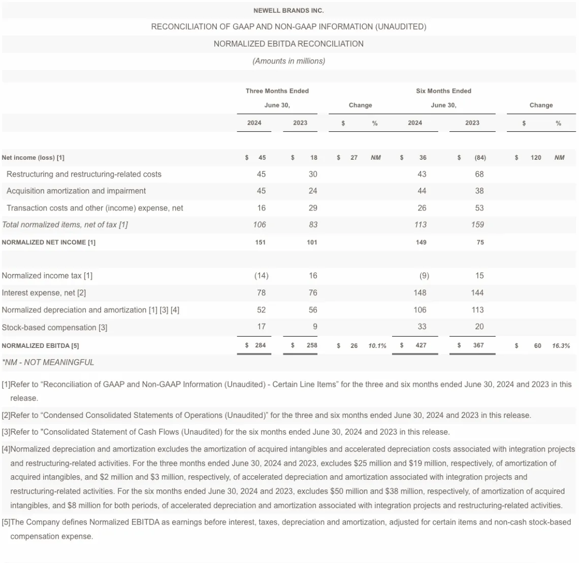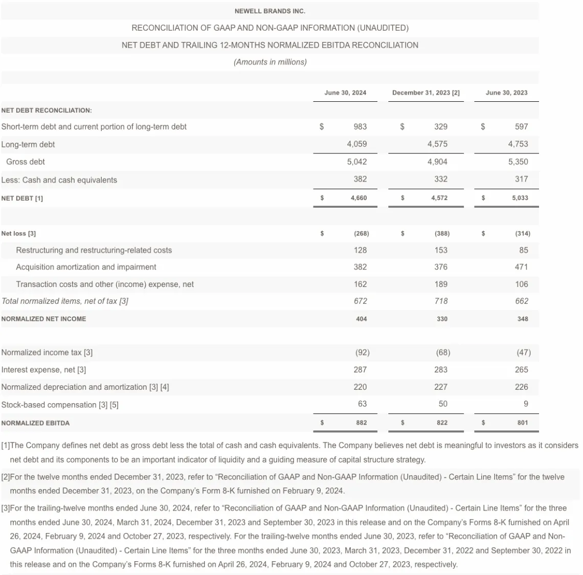 At the end of the second quarter, Newell Brands had debt outstanding of $5.0 billion and cash and cash equivalents of $382 million, compared with $5.4 billion and $317 million, respectively, at the end of the second quarter of 2023.