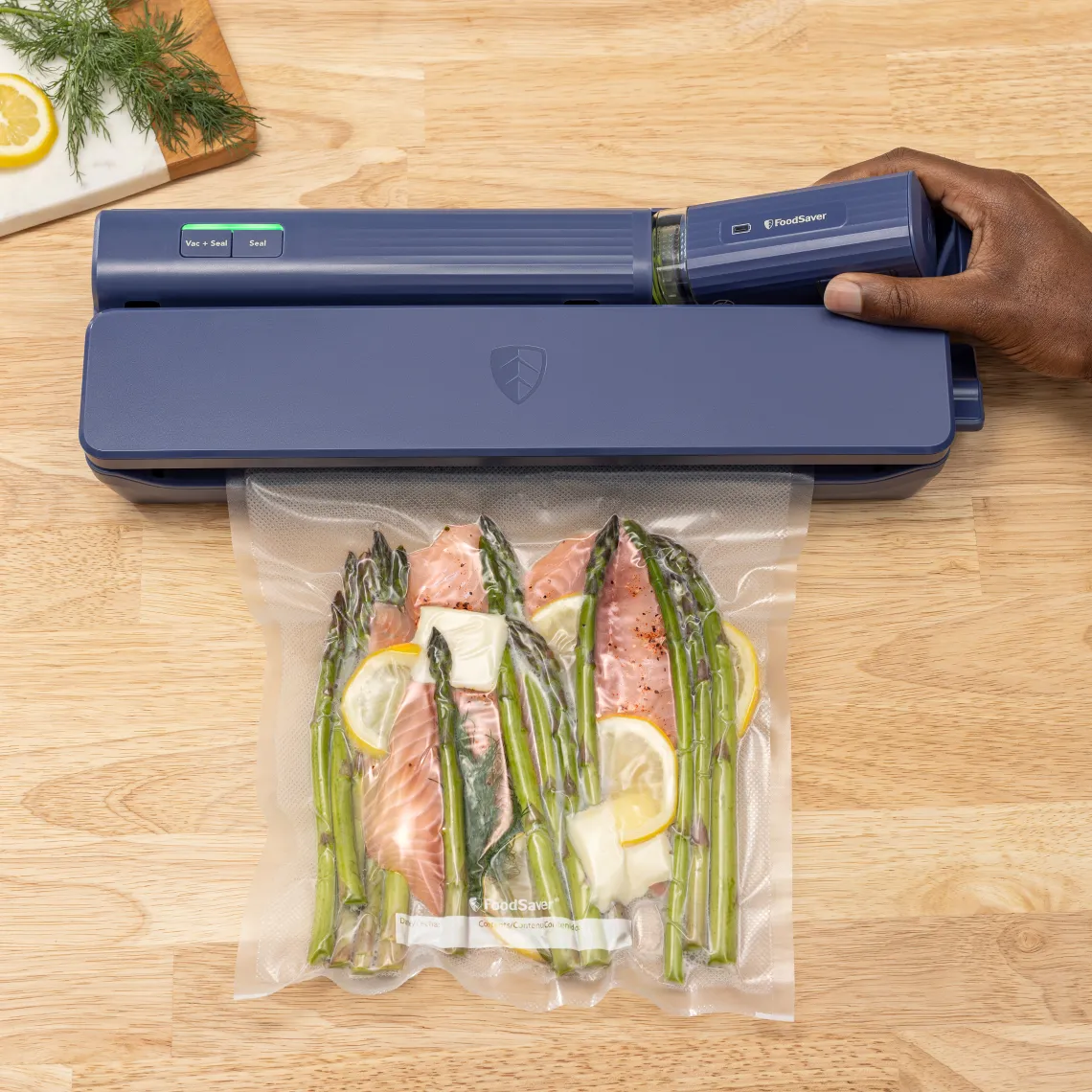 This first-to-market, innovative vacuum sealer combines countertop convenience with a detachable cordless handheld unit, ensuring food stays fresher for longer. As the only vacuum sealing system on the market to include a detachable cordless handheld unit, users can easily vacuum seal, heat seal, and marinate all with one device. The handheld unit allows for quick marination, eliminating hours of waiting. Plus, the long-lasting battery lets you seal up to 35 zipper quart bags on a single charge. Its compact design fits neatly in cabinets or drawers, and the fingerprint-resistant matte indigo blue finish adds a touch of style to the kitchen.