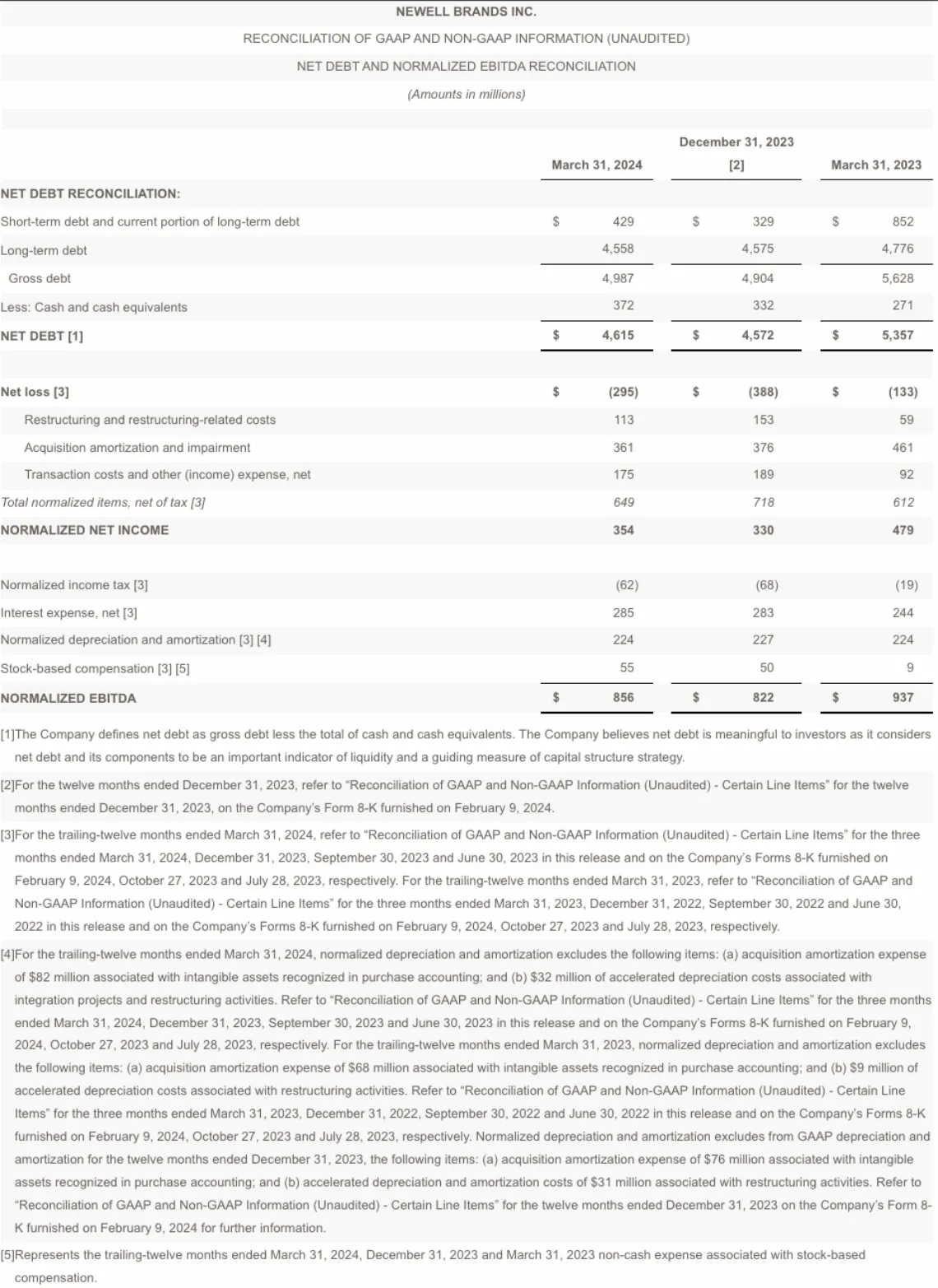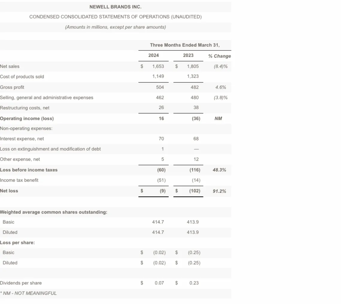 At the end of the first quarter, Newell Brands had debt outstanding of $5.0 billion and cash and cash equivalents of $372 million, compared with $5.6 billion and $271 million, respectively, at the end of the first quarter of 2023.