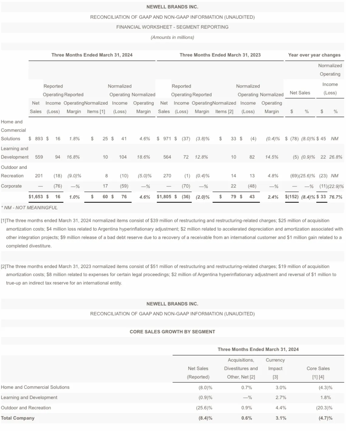 Chris Peterson, Newell Brands President and Chief Executive Officer, said, "The decisive actions we've taken as part of our new strategy have led to excellent progress on the major operational and financial priorities for this year. During the first quarter, core sales performance improved sequentially, normalized operating margin nearly doubled versus last year and we meaningfully increased operating cash flow. We remain confident in our ability to strengthen the company's performance and create value for our stakeholders over time, as we continue to move with speed and agility to operationalize our strategy, which focuses on disproportionately investing in innovation, brand building and go-to-market excellence in our largest and most profitable brands and markets."